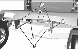 6. Install front draft rod (B) onto mower deck bracket (C) and onto draft bracket (D). Secure stud ends (E) with locking clip (F).