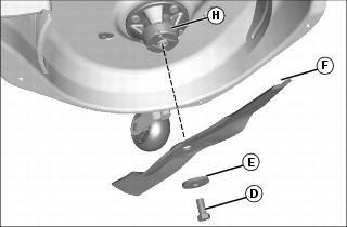 2. Position mower blade (F) with cutting edge toward ground onto mower spindle.