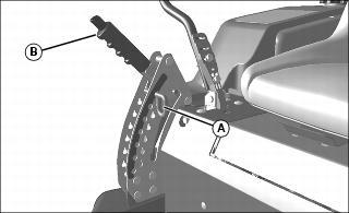 4. Remove pin (A), lower mower deck, and install pin just above lever (B) to lock mower in lowered position.