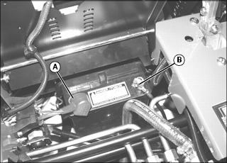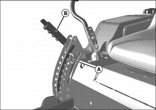 1. Be sure mower is fully raised to the transport lock position, as shown, and insert the pin (A) in the hole just below the mower deck lift lever (B).