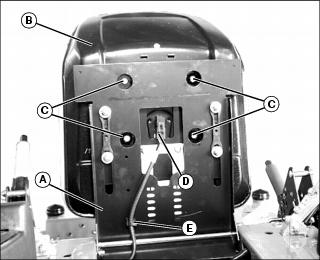 7. Plug in wire harness (D). Route harness on bottom of seat and secure harness plug (E) into hole in seat platform.