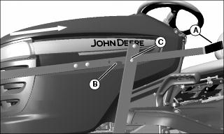 • Pull lift handle (A) toward rear of machine until notch (B) locks on drilled pin (C).