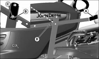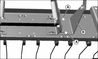 11. Align lift handle bracket (D) so lift handle remains straight as it leaves lift lock extension mounted at tractor frame. Tighten carriage bolts (A).
