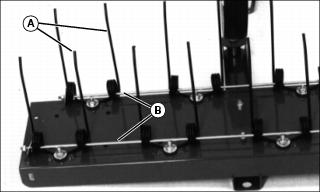 2. Make sure retention safety rods (B) pass through all tines and are secured at ends with washer and locknut.