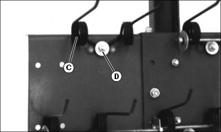 3. Remove hex nut, carriage bolt, lockwasher, and flat washer (D). Remove and discard damaged tine set (C).