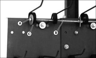 1. Remove locknut and washer (A) from end of retention safety rod (B). Keep nut and washer.