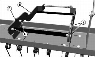 2. Attach mounting frame (D) to frame mounting brackets with four 5/16x1 in. carriage bolts (E), lockwashers, and hex nuts. Mounting frames and frame mounting brackets should be aligned so hole in notch (F) is visible as shown. Tighten nuts completely to ease in assembly; nuts will be loosened later for leveling procedure.