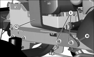 3. Install lift lock extension (G) and spacer strap (H) using existing holes in left side of tractor frame. Secure with two M10x30 flange bolts (I) and M10 serrated hex nuts. Tighten nuts completely. As nuts are tightened the heat shield will form up to proper position.