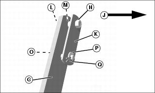 4. Assemble lock bracket (K) to the lift lock extension (G) and secure with 5/16x1-1/4 in. carriage bolt (L), spacer (M), and locknut (N).