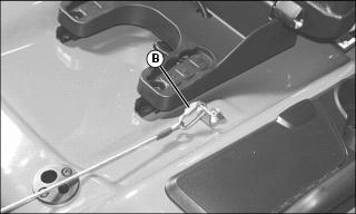 2. Raise seat and unlatch cable and chain assembly chain link (B) from tractor fender deck. Lower seat.
