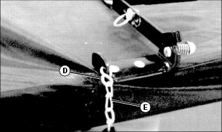 5. Raise seat and make sure cover is chained to fender deck with chain link (F). Lower seat.