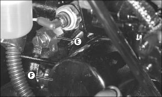 8. Check radiator hoses and air bleed hose at side radiator (F) and intermediate tube (G) for damage or cracking. Replace if necessary.