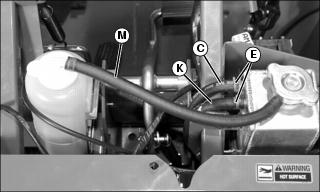 11. Check air bleed hoses (C) and (K), and recovery tank hose (M) for damage or cracking. Replace if necessary.