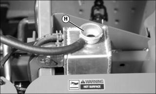 4. Add coolant to de-aeration tank (H) until full. Do not install pressure cap at this time.