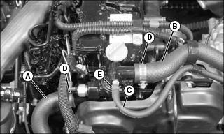 5. Connect air bleed hose (D) at thermostat housing on engine.
