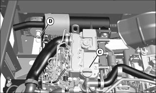 7. Connect air bleed hose (D) at thermostat housing on engine.