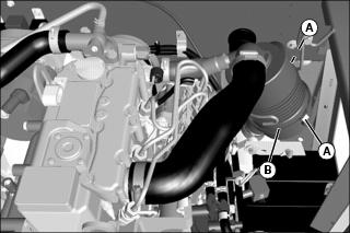 6. Remove and discard oil filter (B) at rear facing side of engine. Wipe off filter base on engine.