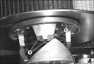 7. Tighten axle housing nuts (A) to 90 N•m (70 lb-ft), then back off adjustment bolts (C) one half turn to relieve force on bolt.