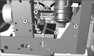 3. Remove hardware (A) and hose support (B) at top of belt guard. Loosen, do not remove, hardware (C) at bottom of belt guard. Lift belt guard (D) from vehicle.