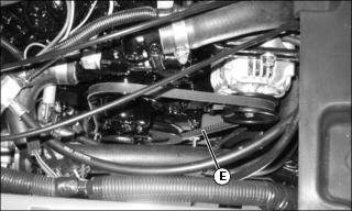 4. Apply moderate thumb pressure to belt (E) halfway between pulleys. Belt should deflect approximately 9 mm (3/8 in.).