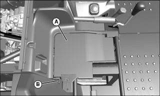 2. Locate service access panel (A) under passenger seat. Pull back on latch (B), and remove panel.