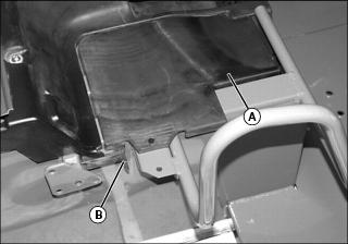 2. Locate service access panel (A) under passenger seat. Pull back on latch (B), and remove panel.