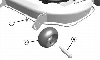 3. Remove bolts (A) and right (B) and left (C) mower deck gates. Retain hardware.