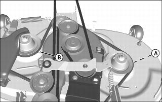 Use flexible grease gun hose guided through recessed areas (A) on mower deck, and lubricate two mower spindle grease fittings with two pumps of grease at specified interval.