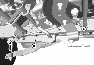 6. Remove 10 x 28 mm drilled pins (A) and locking rings from shorter inner lift rod (H), and remove lift rod from machine.