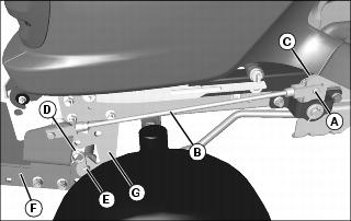 5. Remove 4.5 x 90 mm spring locking pin (D) and front draft pin (E); slide blade and lift assembly (F) away from front draft assembly (G).