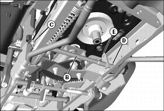 2. Install small end of rockshaft (B) through hole (C) on right side of machine frame, then pull large splined end through hole (D) on left side of machine frame. Make sure bracket (E) on rockshaft is pointing up.