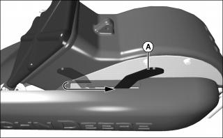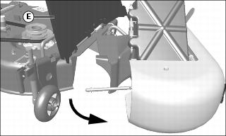 4. Raise mower deck discharge chute (E) and pivot POWER FLOW away from deck.