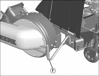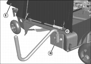 6. Raise discharge chute (E), and remove short end (G) of bent pin from front mounting bracket (H).
