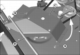 2. Loosen two locknuts (B), and push deck belt shield (C) rearward. Rotate front side inward, as shown, and remove belt shield from under bar (D) and off of mower deck.