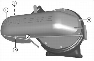 6. Install belt shield (I) to POWER FLOW with washer (J) and bottom nut (K), top nut (L), and one bolt (M).