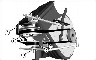 4. Move belt brackets (E) perpendicular to outer edges of sheave and idler. Leave 3 mm (1/8 in.) clearance between brackets and outer edges.