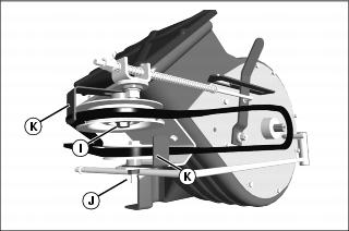 7. Loosen nut (I) on idler and nut (J) on sheave.