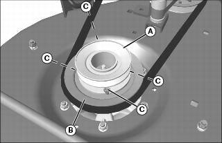 1. Install upper sheave (A) onto right spindle sheave (B), lining up slots in upper sheave with holes in spindle sheave. Secure with four M6x16 bolts and M6 nuts (C). Tighten hardware to 9 - 17 N•m (7 - 12 lb-ft).