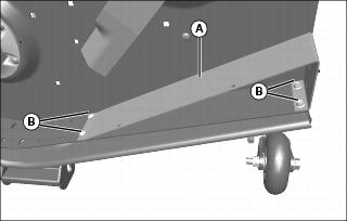 1. Install front baffle plate (A) onto right front of mower deck with four M8x20 carriage bolts (B) and M8 flange locknuts. Tighten to 10 - 30 N•m (8 - 22 lb-ft).