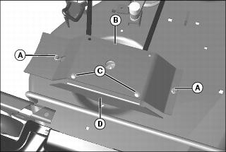 2. Remove two carriage bolts (C) and locknuts, and remove side shield (D) from deck belt shield. Retain hardware, and set aside side shield for future installation.