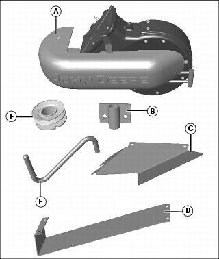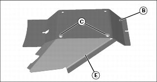 3. Install lip of POWER FLOW deck belt shield (E) below deck shield (B), and secure with two carriage bolts (C) and locknuts just removed. Tighten locknuts to 30 N•m (22 lb-ft).