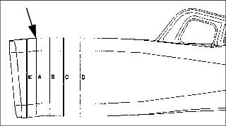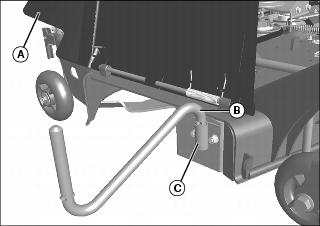 1. Raise discharge chute (A), and install short end (B) of long bent pin in front mounting bracket (C).