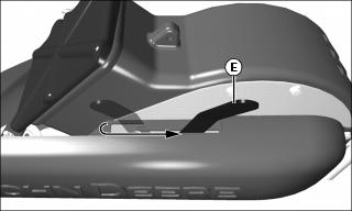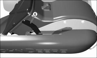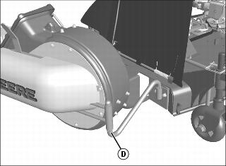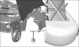 5. With discharge chute (A) still fully raised, pivot rear of POWER FLOW toward deck. Insert bent pin (H) into large hole (I) in right rear gage bracket and into smaller hole on opposite side.
