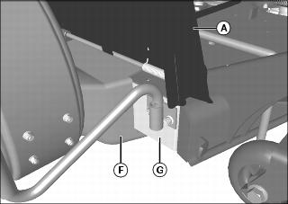 4. Fully raise mower deck discharge chute (A), and rotate POWER FLOW housing (F) rearward and next to front baffle plate (G).