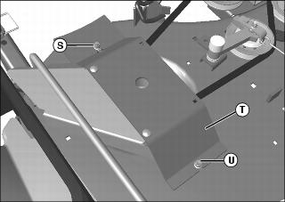11. Rotate front side (T) of deck belt shield into position, slide forward, and tighten locknuts (S) and (U) to 30 N•m (22 lb-ft).