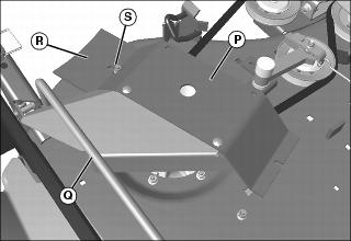 10. Lower modified deck belt shield (P) onto deck and under bar (Q), as shown, with rear end (R) of deck belt shield installed on rear locknut (S) first.
