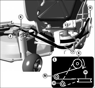 8. Locate belt installation label (L) on belt shield and verify correct drive belt installation. The drive belt must run: