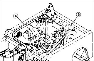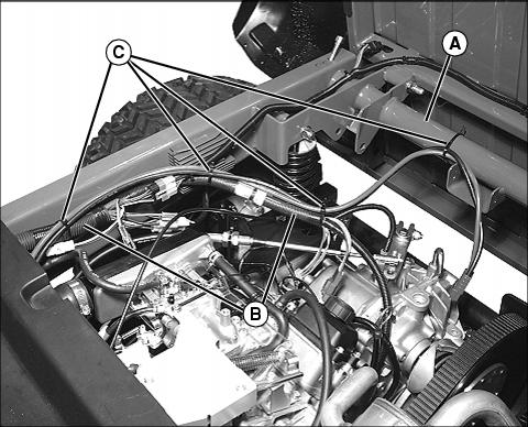 1. Route 1.6 m (64 in.) battery cable wiring (B) from battery into chassis tunnel (C) between seats. Pull harness through tunnel and up to solenoid.