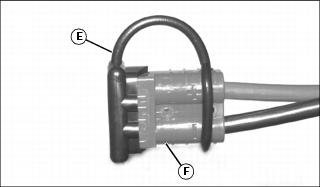 5. Install dust cover (E) to front mount wiring harness connector (F).