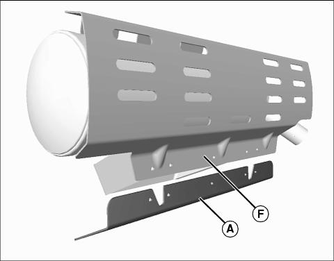7. Install the optional heat shield (A) at the inside of the lower flange of the existing muffler shield (F). The mounting flange is at the top, the shield is angled forward, and the clearance notches surround the two muffler support brackets.